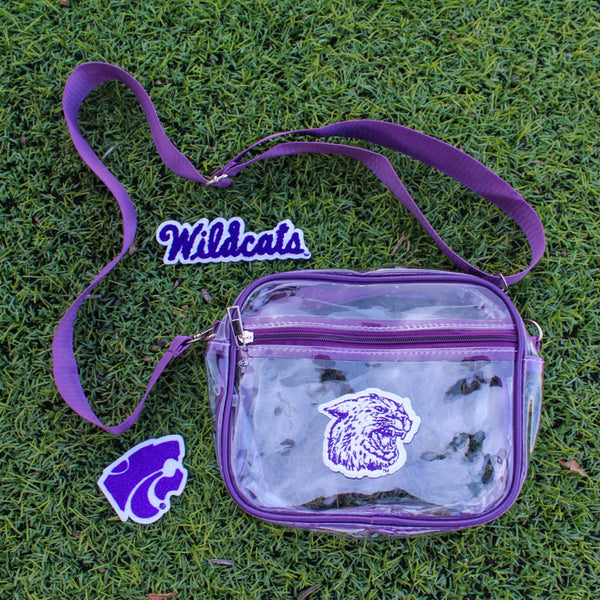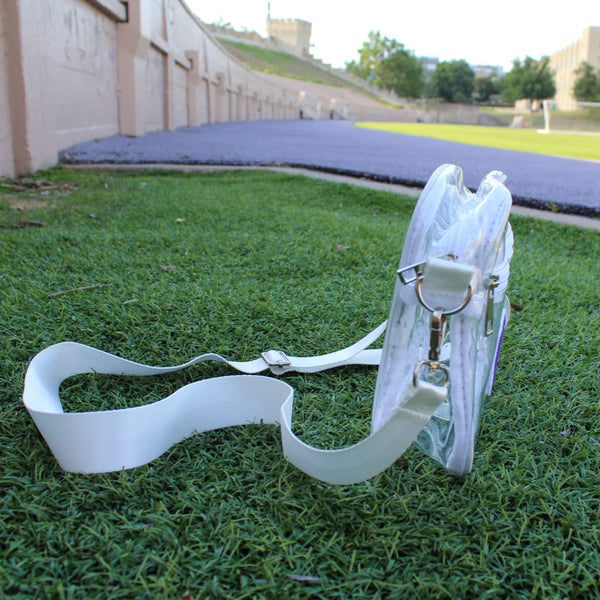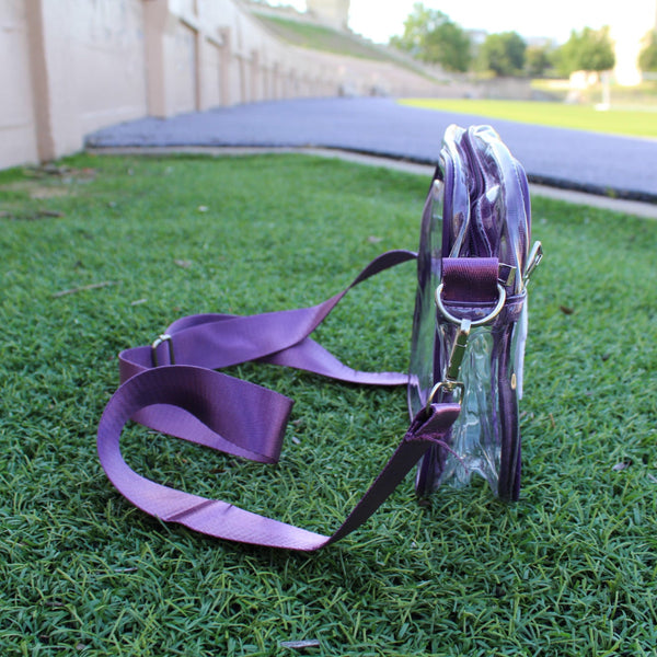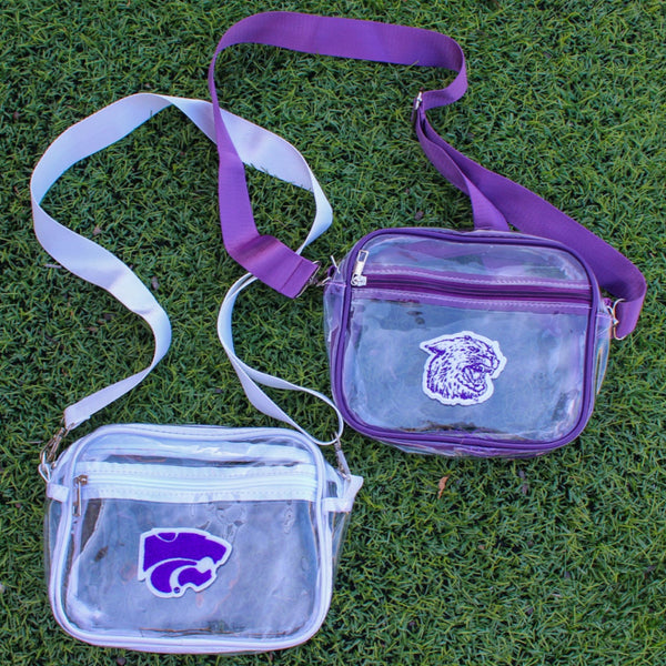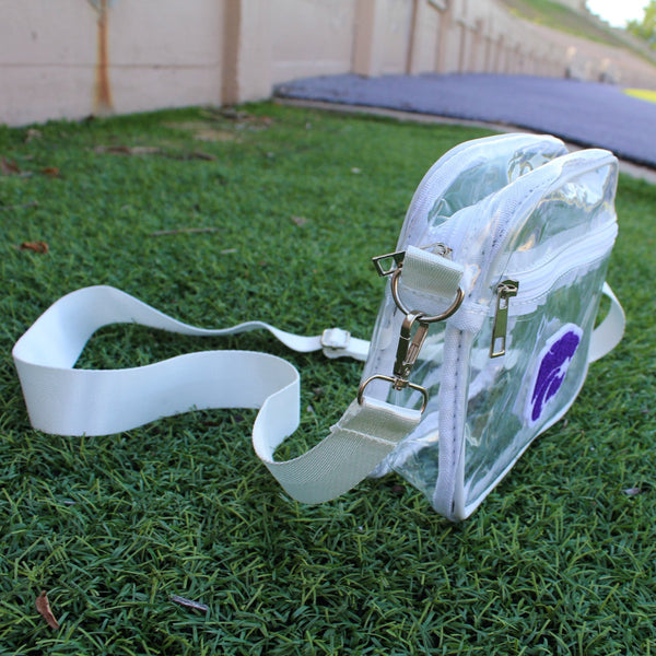 Featuring a rectangle shaped clear bag with outside zipper pocket and removable strap. *Colors sold separately