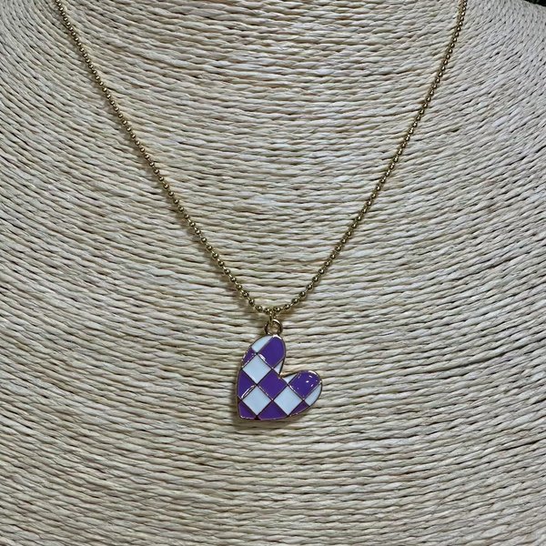 Erimish purple checkered heart necklace on a gold chain.