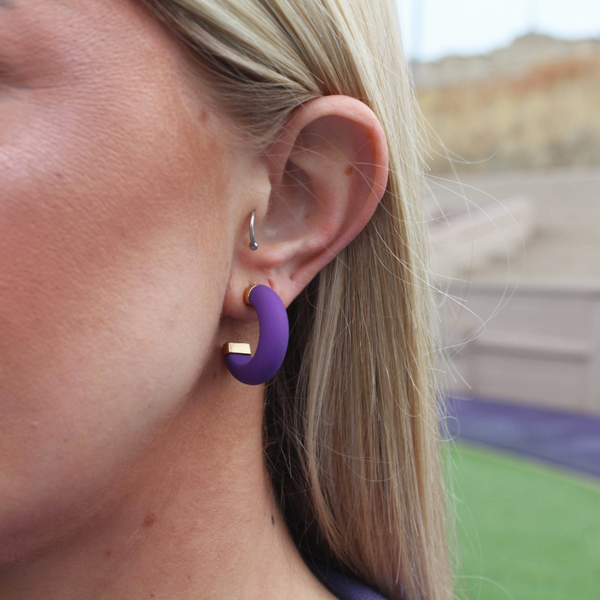 Michelle McDowell earring featuring a purple hoop and gold metal accent.