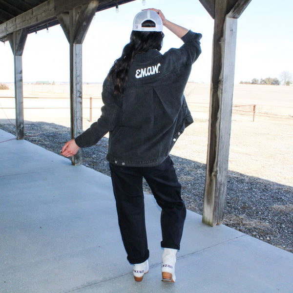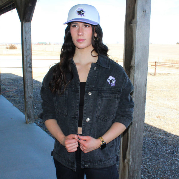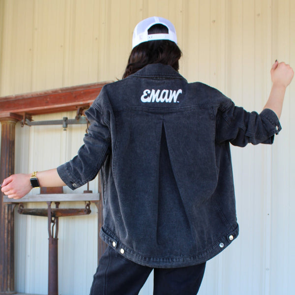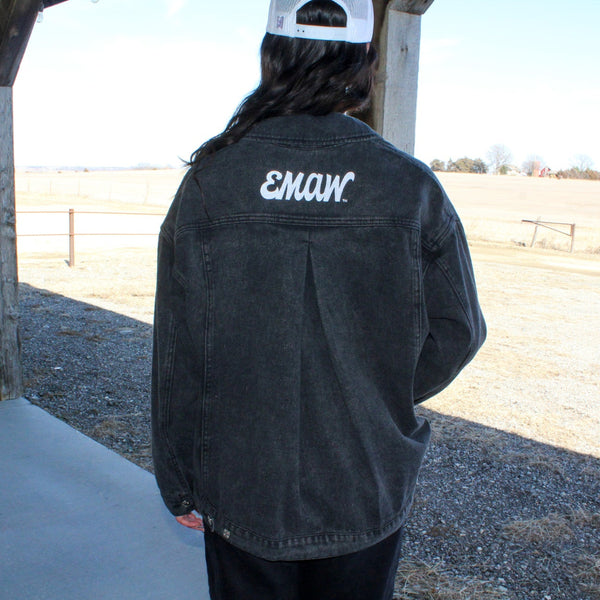 Featuring a black wash denim with silver front buttons, two chest and two side pockets and a longer hem in the back. K-State Willie embroidered on front left chest with EMAW embroidered on back.