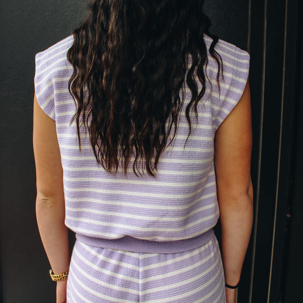 Featuring a soft, knit fabric with sleeveless, wider arm hole and banded bottom.